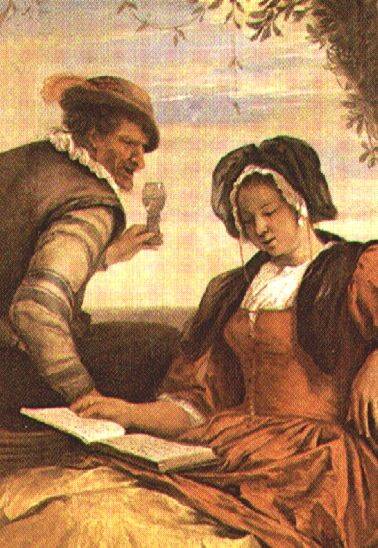 Op een detail van het schilderij van Jan Steen, Zingend paar en de luitist op een terras, geschildert ca. 1660-63 kunnen we zien dat de man uit een roemer drinkt