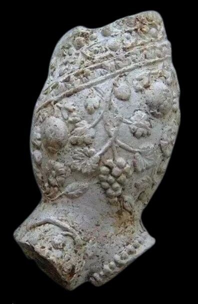 3a. Op ontbrekende steel Druivenranken met druiventrossen, bloemen en aapjes en de tekst LICHTIVS / ANNO 1632