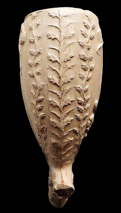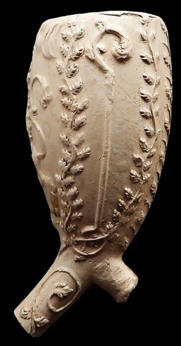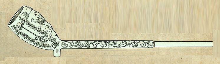 Opmerking: De steel was ook versierd met een slingerende bladrank en had een lengte van 85 cm. Deze pijp staat vermeld in Catalogus nr 1 van de firma P van der Want van begin 1900.