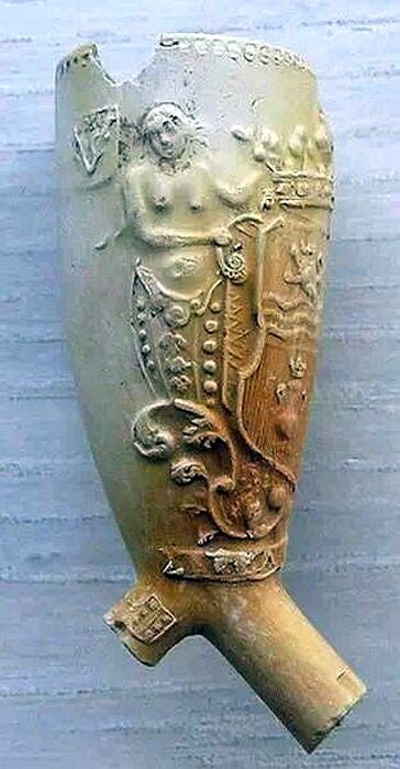 Naast het gezicht van de twee halfvrouwen zien we de wapenschilden