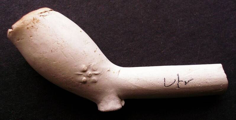 In 17th and 18th-century pipemakers' centers, pipes were made with a rose-shaped relief decoration on both sides of the bowl. This type of pipe was also sold in the city of Utrecht, especially towards the end of the 17th century. A striking feature of the Utrecht pipes with this stylistic rose decoration are those with four-petaled roses, which are formed from five dots with four cross-shaped sepals in between. These pipes have the typical slender Utrecht shape with the small rose decoration on both sides of the bowl.