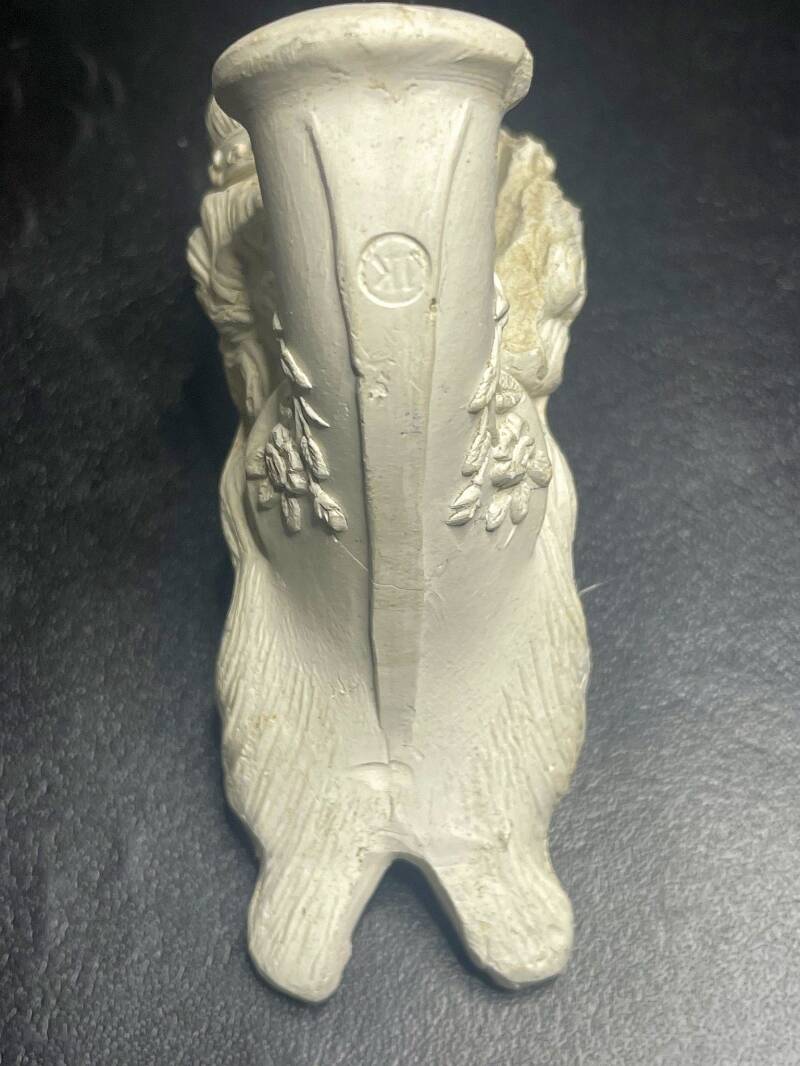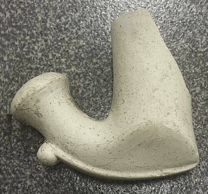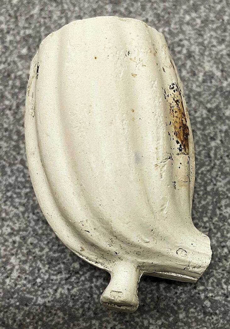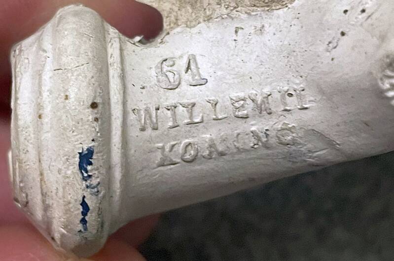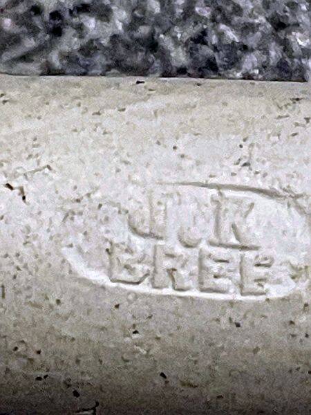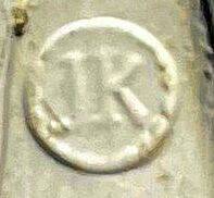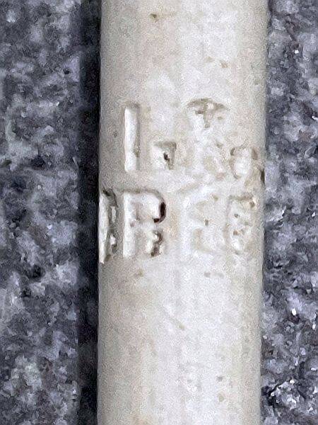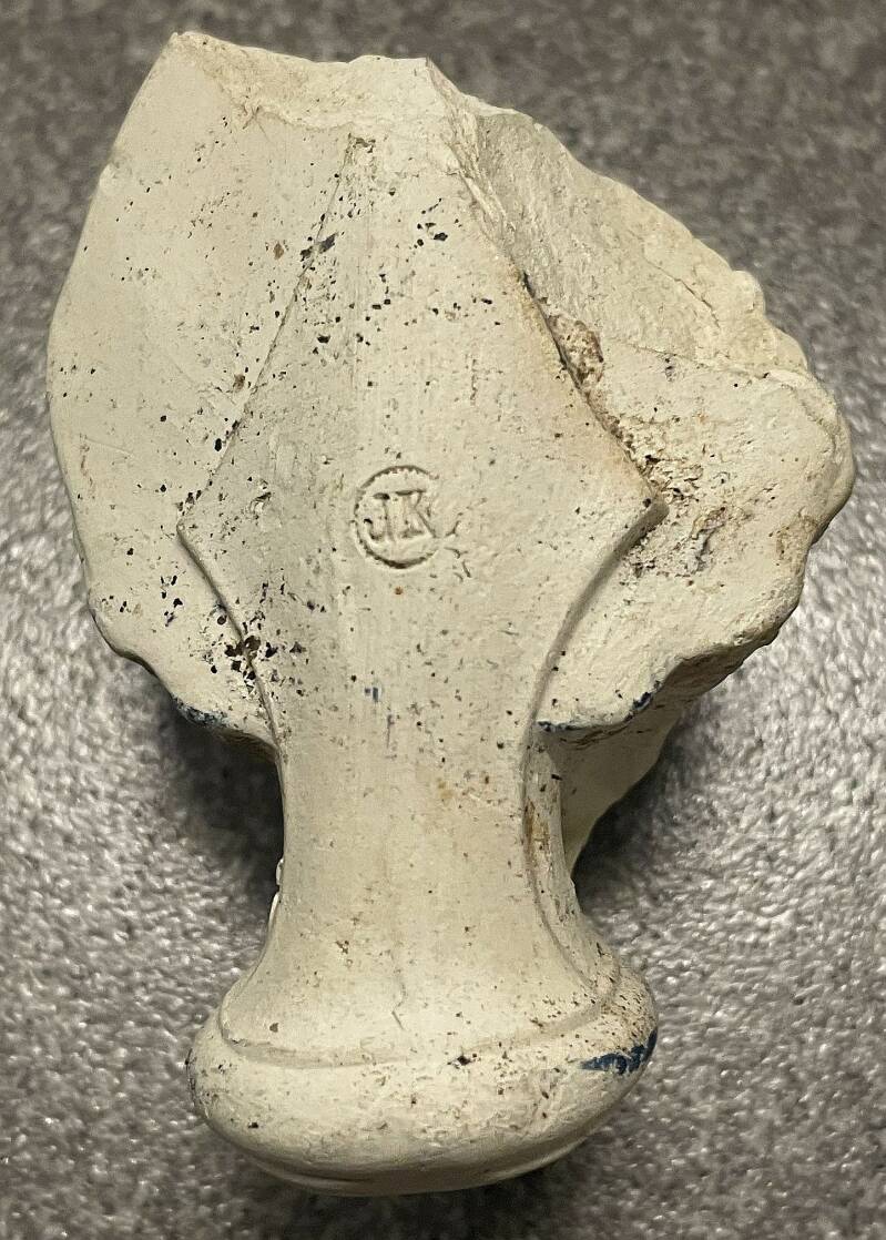 Hoewel de pijp niet is terug te vinden in de bekende literatuur of catalogi, schrijven we hem toe aan de pijpenmaker J.J. Knoedgen omdat dezelfde pijp D-6121 in het plaatsje Brée is gevonden nabij de Gerdingerpoort in een pijpenstort.