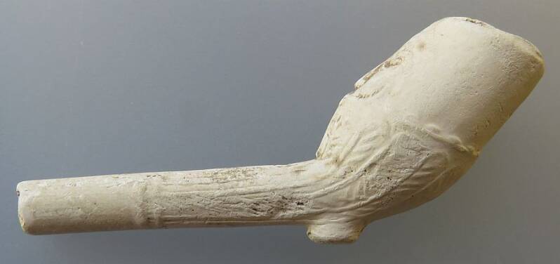 Jonas pipes were produced in several clay pipe manufacturing centers. In this short article, we present a Jonas pipe that is typical of those made in Leiden. On the upper half of the bowl, we see the face of Jonas, while the lower half is decorated with a stylized leaf motif. This type of leaf design is commonly found on pipes from Leiden made at the end of the 17th century. On this particular pipe, there is no fish or whale's mouth on the stem; instead, the leaf motif continues onto the stem. The heel mark is an oval with dots, which was also frequently used on Leiden pipes from that period.