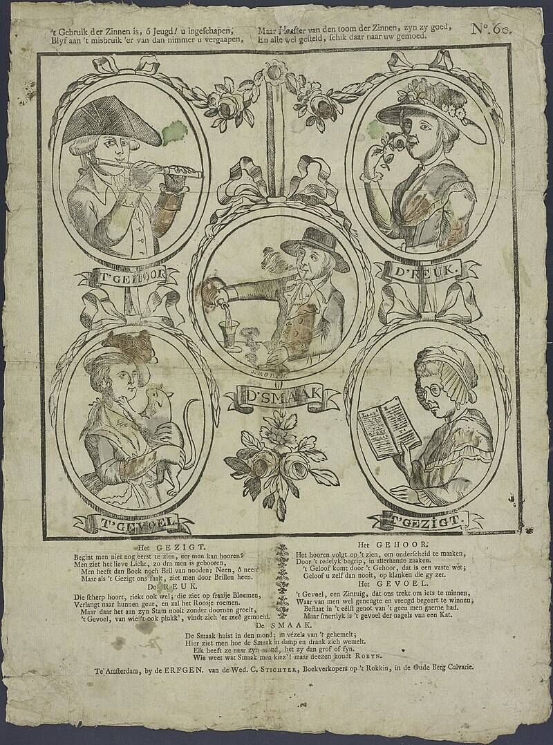 Aristoteles de filosoof en wetenschapper uit de Griekse oudheid benoemde al de "Vijf Klassieke Zintuigen" die mooi zijn weergegeven op een Centsprent uit circa 1800. Het GEHOOR (man speelt op een dwarsfluit), de REUK (vrouw ruikt aan een bloem), de SMAAK (man rookt een pijp en schenkt een drankje in), het GEVOEL (vrouw wordt gekrabd door een kat), en het GEZICHT (vrouw leest een boek). De vijf klassieke zintuigen vinden we vaak terug in genreschilderijen en prenten uit de 17e en 18e eeuw.