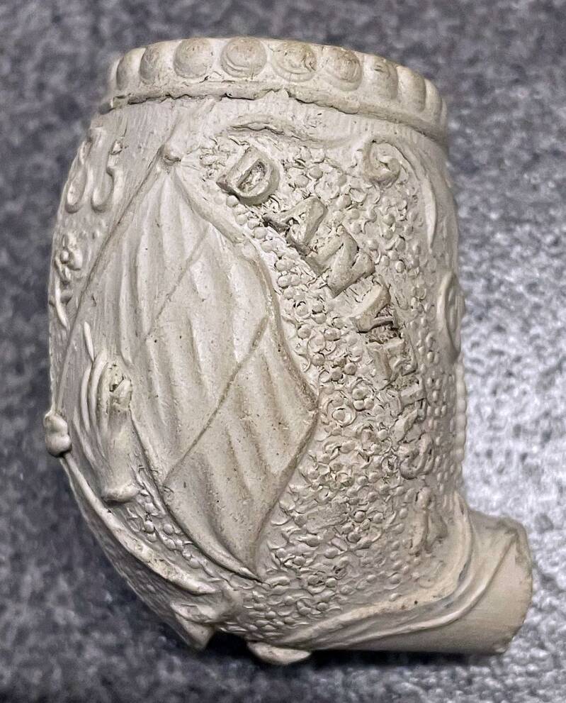 A unique clay pipe, inscribed "D ANVERS EXPOSITION 1885" and adorned with Belgian flags and Antwerp hands, was discovered by Mathieu Bloemen in a pipe dump of the J.J. Knoedgen factory in Bree. This pipe, dating from the 1885 Antwerp World's Fair, is an exceptionally rare find, not previously seen in collections or online.