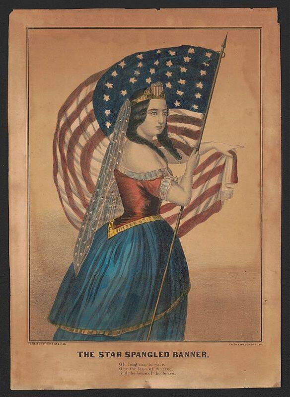 In the lithograph, we see Lady Liberty crowned with an American emblem, holding the American flag, and pointing toward victory — the victory that took place in 1814: the defense of Fort McHenry by American troops during the British attack on September 13. The lithograph therefore refers to an event in American history that took place earlier.