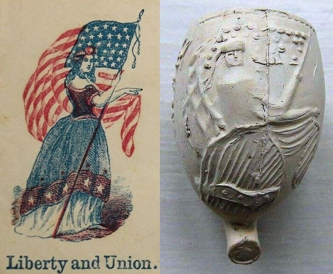 When zooming in on the depiction, we can see that the flag contains stars. With that information, I started googling “woman and flag with stars.” After much searching and browsing online, I came across an image that undoubtedly carries the same elements as the depiction on the pipe.