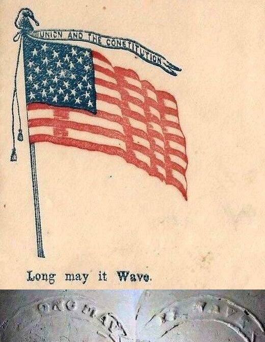 I continued searching on the internet, and yes — BINGO! Just like Lady Liberty with the text “Liberty and Union”, the motto “Long may it wave” was also used by the patriots, accompanied by the American flag on the envelopes in which they sent their letters. We can see that the flag carries 34 stars. The 34th star was added for Kansas in 1861, which was the same year the 13 Southern states seceded, leading to the outbreak of the American Civil War.