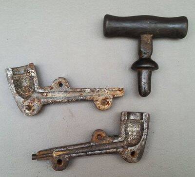 In the image below we see an iron pipe mold with a dotter. The engraving on the pipe described here is, when compared with what we know from pipes of the 18th and 19th centuries, not of high quality. Lady Liberty is rendered in a very stiff manner, and overall the design is quite crude. The heel bears the mill mark, which brings us — considering the time when the image was topical — to the pipe maker Frans Simon Sparnaaij, a Gouda pipe maker active from 1839 to 1880.