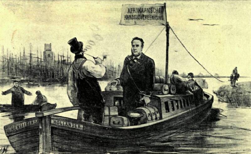 Spotprent: Lodewijk Pincoffs vertrek uit Rotterdam met een trekschuit