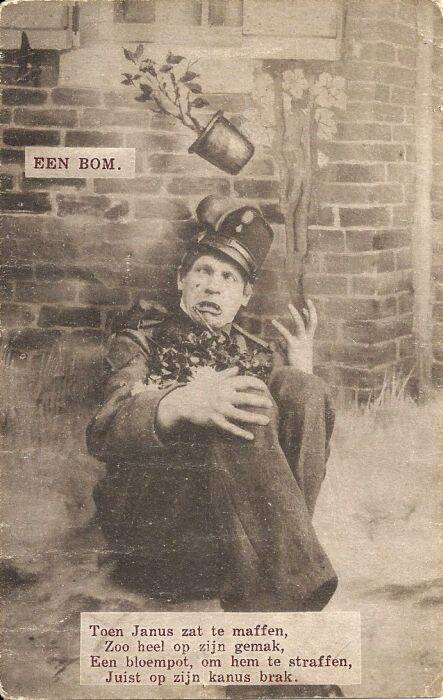 Op dat moment resteerde nog één voorstelling waarvan ik de bron niet had gevonden: die van de soldaat die een bloempot op zijn hoofd krijgt. Inmiddels, weer een paar jaar later, trof ik bij toeval op Marktplaats een prentbriefkaart aan met de titel EEN BOM — de ontbrekende voorstelling waarnaar ik op zoek was. Blij verrast benaderde ik direct de verkoper met de vraag of ik alleen die kaart kon overnemen, aangezien hij een serie te koop had staan. Gelukkig ging hij hiermee akkoord.