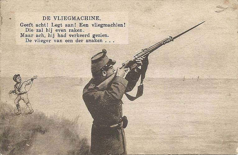 In the first article, "Saved from the Dumpster", I describe how this collection came into my possession. In the second article, I discovered a postcard on a Dutch marketplace website (Marktplaats) from World War I, featuring an image that had served as a model for one of the transfer prints on the pipes. The image included a humorous rhyme, showing a soldier aiming his rifle at a kite, mistaking it for an aircraft. This discovery led to the article titled "THE FLYING MACHINE."